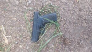 Entrando pelo bairro Jardim Ipanema, o suspeito arremessou a arma para fora do veículo durante a fuga, os policiais fizeram acompanhamento até conseguir parar o veículo e abordar o suspeito que tentou dispensar a arma, com o criminoso abordado os policiais retornaram ao local onde ele teria jogado a arma.