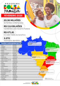 ESTADOS — Na divisão por unidades federativas, o maior número de contemplados em fevereiro está na Bahia. São mais de 2,47 milhões de famílias beneficiárias no estado, a partir de um aporte federal de R$ 1,63 bilhão. São Paulo aparece na sequência, com 2,46 milhões de contemplados. Em outros seis estados há mais de um milhão de integrantes do programa: Rio de Janeiro (1,585 milhão), Pernambuco (1,582 milhão), Minas Gerais (1,574 milhão), Ceará (1,454 milhão), Pará (1,355 milhão) e Maranhão (1,229 milhão).