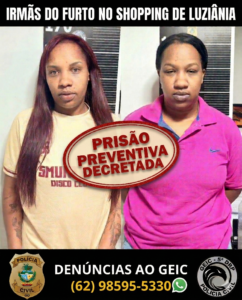 As irmãs presa pelo GEIC da polícia civil em Luziânia, realizou na última sexta feira 19/03 uma operação policial para prender através de mandado de prisão duas irmã criminosas acusadas de furtarem várias mercadorias inclusive um aparelho celular como mostra no vídeo em uma loja no shopping de Luziânia avaliado em em r$ 2,500 reais, além do aparelho vária outras mercadorias que no total amargou para o empresário um prejuízo que passava de r$ 5,000 mil reais.