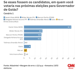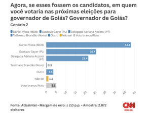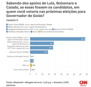 Aqui, Daniel Vilela, com o apoio de Caiado, tem 43,5% das intenções de voto. Na sequêcia, vêm Wilder Morais, com o apoio de Bolsonaro, que pontua 18,7%, e Adriana Accorsi, com o apoio de Lula, que chega a 18,2%.