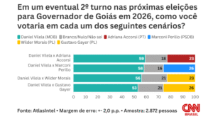 O instituto analisou ainda quatro eventuais cenários de segundo turno envolvendo Daniel Vilela e Adriana Accorsi, Marconi Perillo, Wilder Morais e Gustavo Gayer. Veja os resultados nos gráficos abaixo: