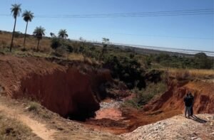 A cratera com cerca de 500 metros de comprimento e 20 de profundidade que surgiu em Valparaíso de Goiás, avança em direção à BR-040 e já representa risco ao shopping Brasil Center, que fica próximo ao local.