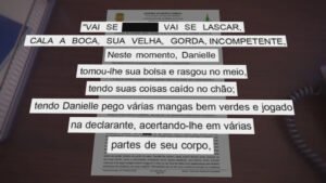 Em seguida, a suspeita perguntou sobre o cardápio do dia seguinte. Nesse momento, ela respondeu que não sabia e a filha da patroa se irritou. Cleonice contou aos policiais que Danielle a xingou várias vezes. De acordo com a empregada doméstica, ela foi chamada de “velha gorda e incompetente”. Além disso, a a mulher falou que a empregada não poderia comer a comida, já que ela não havia comprado e a expulsou de casa. Segundo Cleonice, Danielle ainda tomou a bolsa dela, rasgou e jogou no chão tudo que estava dentro. Ainda de acordo com o depoimento, Cleonice disse que a filha da patroa pegou mangas que estavam no quintal da casa e arremessou contra ela. As frutas atingiram “várias partes do corpo” da empregada.