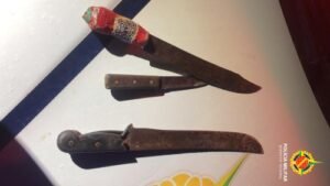 Durante o patrulhamento, os policiais avistaram o suspeito portando o facão e agindo de forma agressiva contra familiares