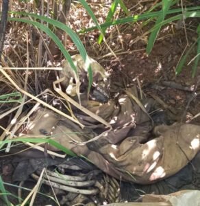 Ainda ao solo em meio ao mato os guardas observaram que exposto à vegetação tem um crânio, ossadas da costela e um dos braços, ao lado da ossada vários panos e inclusive um colchão que possivelmente faça parte do cenário.