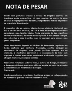 A Deputada estadual Dra. Zeli, assim como governador Ronaldo Caiado, se manifestou nesta quinta-feira, 12/02 sobre a tragédia ocorrida em Itumbiara, no sul de Goiás, que resultou na morte de duas crianças, de 12 e 8 anos, além do próprio autor do crime, atingindo a família do prefeito Dione Araújo.