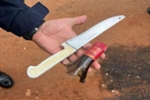 Com ele, os policiais militares também apreenderam um facão e um pedaço de garrafa de vidro quebrada (foto abaixo), que seriam usados contra a mulher.