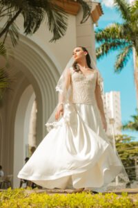 A história do vestido também se conecta diretamente à trajetória da estilista que o criou, uma jornada marcada por transformação, conceito que dialoga simbolicamente com o próprio vestido de noiva que aparece na novela.