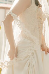 Para finalizar o visual, o vestido recebe uma mantilha em tule leve com acabamento em renda gripir de algodão. O detalhe amplia o caráter bucólico e poético da cena, reforçando a estética de delicadeza artesanal que marca o trabalho da marca.