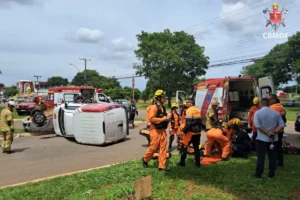 O Corpo de Bombeiros Militar do Distrito Federal (CBMDF) foi até o local com duas viaturas e duas motos de resgate, e constataram que um carro de passeio e uma Fiorino bateram, resultando em um capotamento.