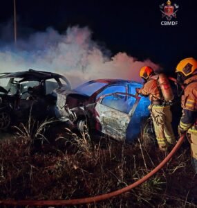 O Corpo de Bombeiros Militar do Distrito Federal (CBMDF) foi acionado para atender a ocorrência e ao chegar no local, encontrou dois veículos em chamas e um homem ao solo, próximo aos automóveis. A vítima apresentava sinais de traumatismo cranioencefálico (TCE) grave, além de múltiplos ferimentos e teve o óbito constatado no local.