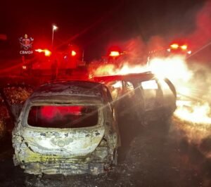 O Corpo de Bombeiros foi acionado para atender a ocorrência e ao chegar no local encontrou dois veículos em chamas